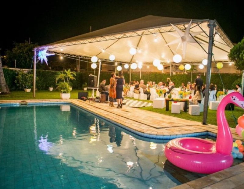 Linda piscina e churrasqueira.