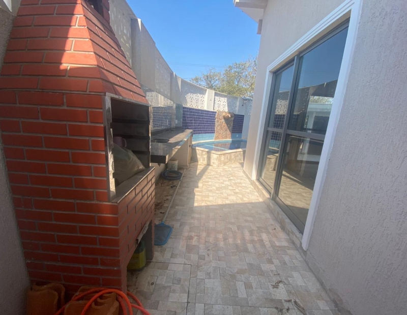 Área externa com piscina, churrasqueira e garagem para cerca de 2 veículos.
