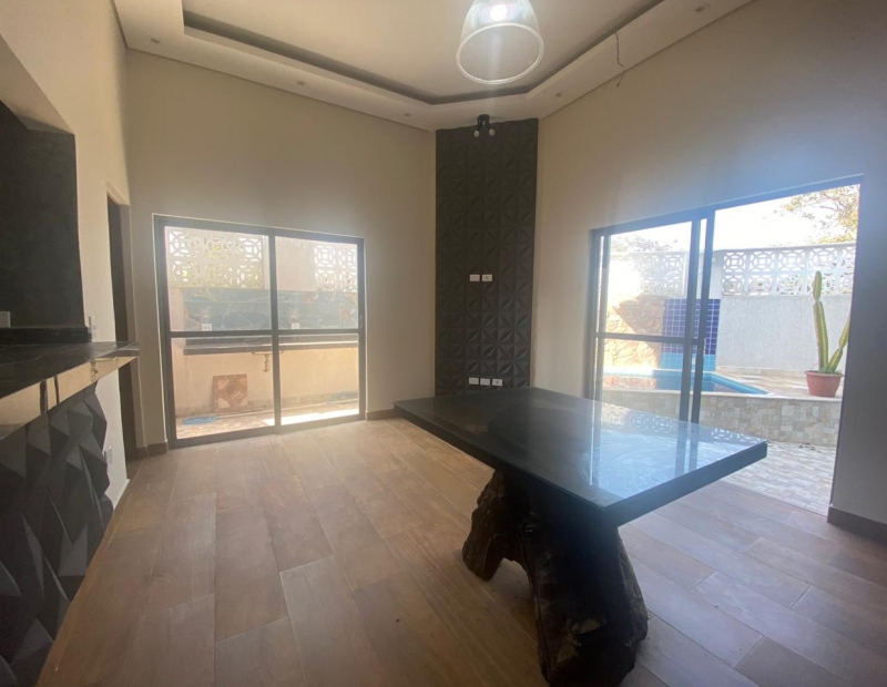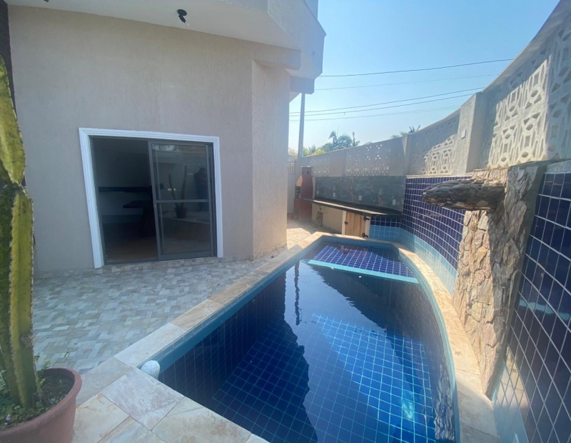 Área externa com piscina, churrasqueira e garagem para cerca de 2 veículos.